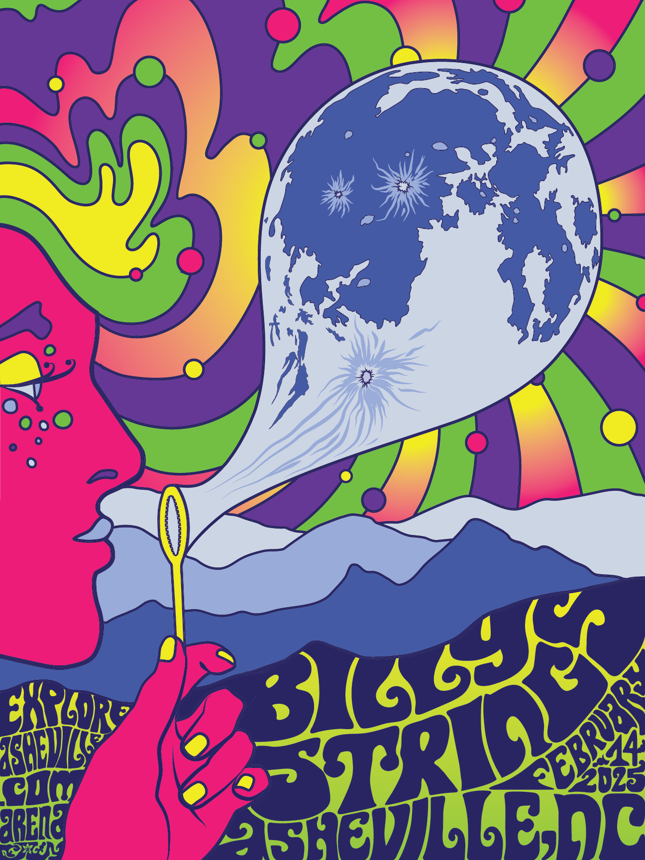 Welcome to the winning concept. Inspired by 1970s art and the work of Peter Max, this idea leans heavily into surrealism, the unexpected, and psychedelic vibes. The focal point is someone blowing a bubble that looks like the moon. The Blue Ridge Mountains at bottom honor the concert’s Asheville location, and the mountains and the moon nod to the nature-focused elements of Billy Strings's songs.